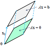 - 兩個等式可被寫作 a‧ x = b , a‧x = 0