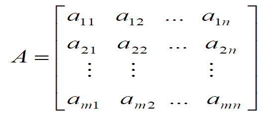 aijor\<A\>ij. 如果 aij 是實數, 通常會被稱為純量(scalars) - 前述的矩陣可被寫成 [aij]m*n 或 [aij]